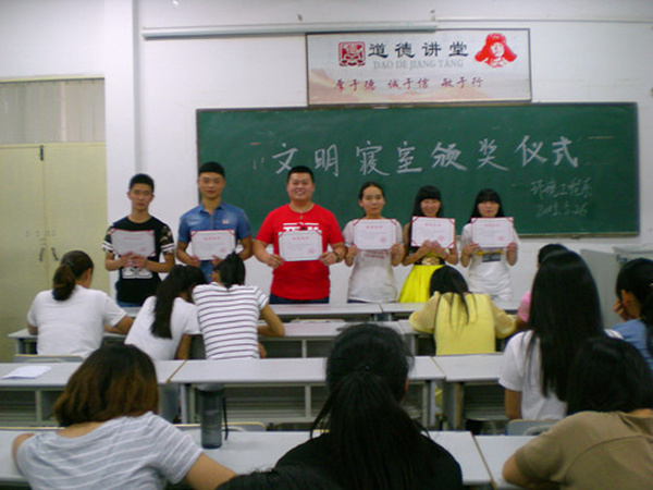 为加强学生宿舍文化建设,提高学生自律能力,增强学生综合素养,创建安全、舒适、温馨、优雅的学习与生活环境,环境工程系自3月30日至5月22日举行了为期八周的文明宿舍评选活动。经过角逐,最终评选出了6个优秀文明宿舍:五号公寓楼:312寝室、403寝室、406寝室,六号公寓楼:432寝室、433寝室和435寝室。 5月26日下在综合楼408教室举行了颁奖仪式,团总支书记铁小霞、辅导员刘为获奖集体代表颁发了奖状和奖品。