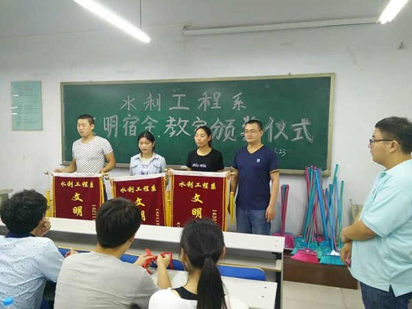 活动中,水利工程系严格按照学生处制定的宿舍检查标准,从卫生、物品摆放到文化建设,提出了详细的要求和整改意见,通过自查、检查、整改、再检查、再整改评选出了25个“文明宿舍”。在“文明教室”评比环节,水利工程系每周组织全体班主任、学管老师集体对固定教室进行检查打分,最终评选出了3个文明教室:142111班、142112班、143011班。6月23日晚,水利工程系在南教305教室举行了活动总结及颁奖仪式,为“文明教室、文明宿舍”颁发了锦旗、证书及奖品。