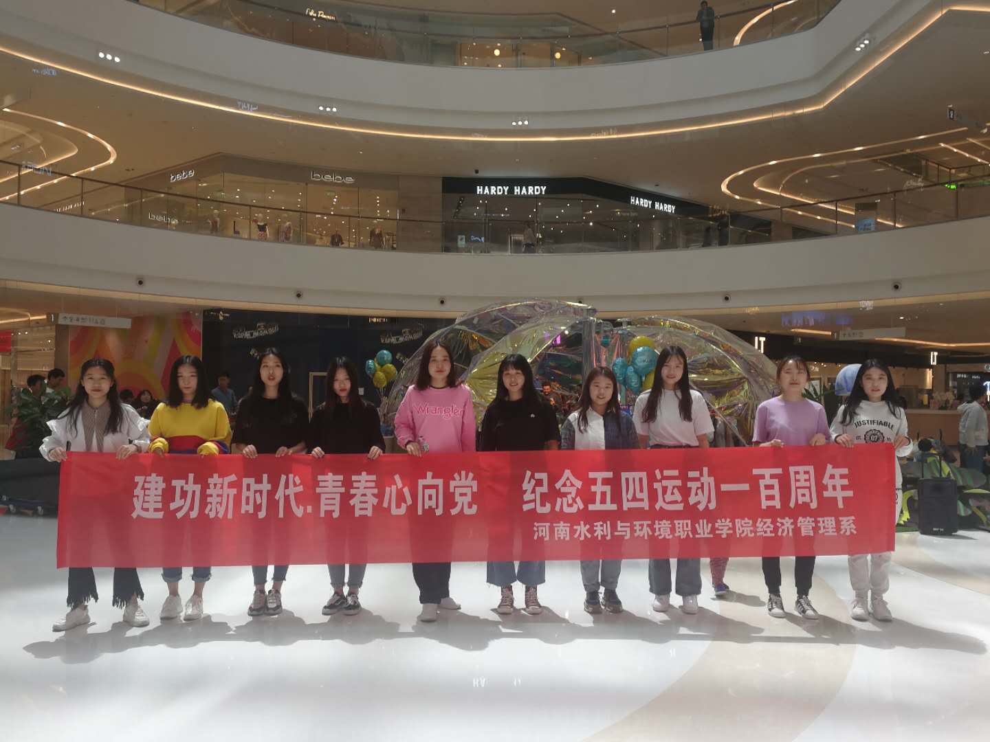 为纪念五四运动一百周年,弘扬五四精神,让更多青年人深入领会五四精神,4月30日、5月5日,经济管理系分别在正弘城商场和校园内开展了纪念五四运动一百周年舞蹈快闪活动。