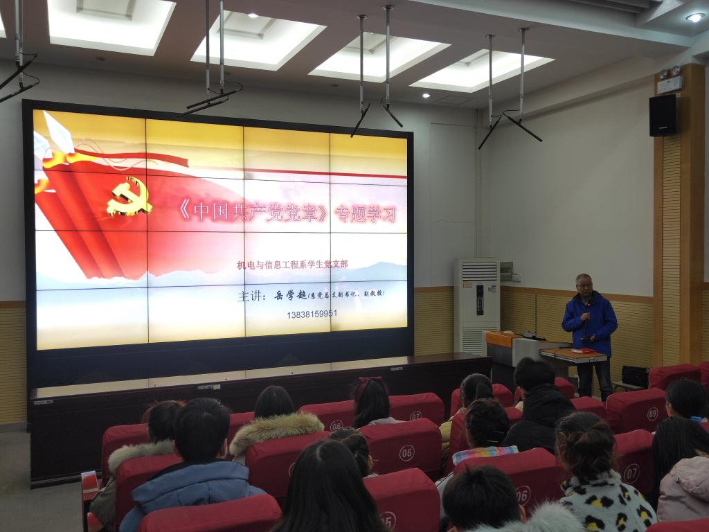 12月30日晚,机电与信息工程系在北教三阶以“新党章学习”为主题开展党课培训。党课由系党总支副书记岳学超主讲,全体辅导员、入党积极分子和有入党意愿同学参加培训。