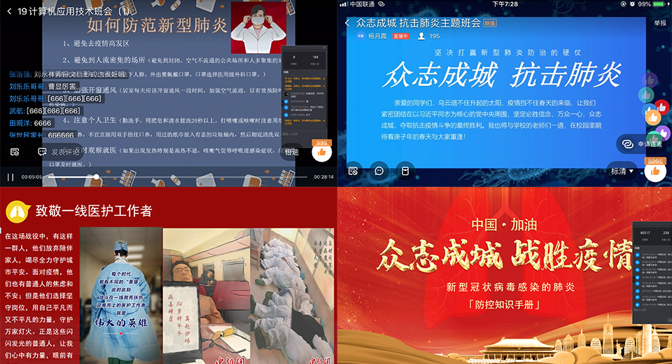 通过网络主题班会,各班老师对学生进行了一次深刻的爱国主义教育、生命教育、社会责任感教育、爱与感恩教育、规则教育。学生在互动中纷纷表示,作为新时代青年大学生,必将珍惜时间和生命,勤学、勤思、勤悟,为打赢疫情防控阻击战贡献自己的一份力量。