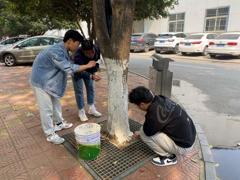 活动中,青年志愿者们在企业技术人员的指导下认真学习了常见的园林植物病虫害、刷白剂配置的方法、树干刷白的步骤及注意事项,将刷白剂均匀地涂到校园内的每棵树干上。活动现场,志愿者们干劲十足、齐心协力,高质量完成了树木涂白工作,为校园内的树木穿上了新装。