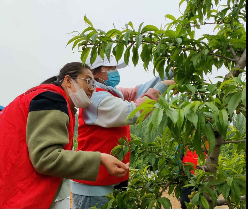 在果园里,教师党员向果农们讲解了果树疏果的原则、方法和注意事项,并现场演示,之后学生志愿者和果农们一起为果树疏果。尽管小雨连绵,但是大家干劲十足,热情高涨。此次志愿服务活动,在为果农服务的同时,也让师生实践了果树疏果的技术,体验了劳动的艰辛。