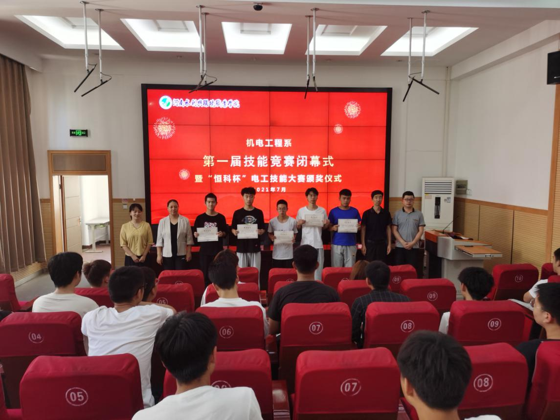 7月9日,机电工程系举行第一届技能竞赛闭幕式暨“恒科杯”电工技能大赛颁奖仪式,系主任王利卿、党总支书记王建军出席,并为获奖学生颁发证书和奖品。