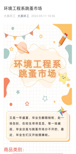 5月11日,环境工程系在线上开设为期两天的 “变废为宝”跳蚤市场,以满足在校学生旧物置换需求,实现资源优化,减少浪费。