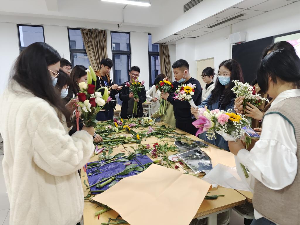在活动现场,花艺师讲解了插花技巧,并现场演示。师生们兴致勃勃,充分发挥想象力和创造力,用向日葵、玫瑰、康乃馨等花材制作了一束束别具特色、生机盎然的花艺作品。