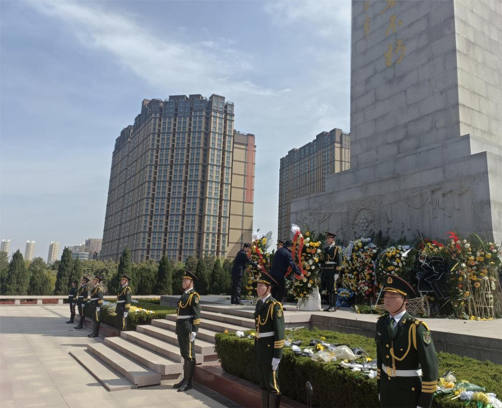 在郑州烈士陵园烈士纪念碑前,国旗班成员向先烈敬献花篮,师生肃立、鞠躬,集体默哀,悼念英魂。系党总支书记王建军在讲话中激励师生要继承先烈遗志,发扬革命精神,珍惜今天来之不易的幸福生活,为强国建设贡献青春力量。