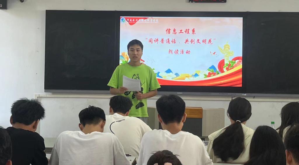 9月25日,信息工程系举办“同讲普通话,绽放文明花”朗读活动。活动现场气氛热烈,同学们以饱满的激情、激昂的语言和大方得体的举止,朗诵了社会主义核心价值观主题诗词,把对党和祖国的感情表达的淋漓尽致。经评比,选出一等奖3名、二等奖9名、三等奖15名。