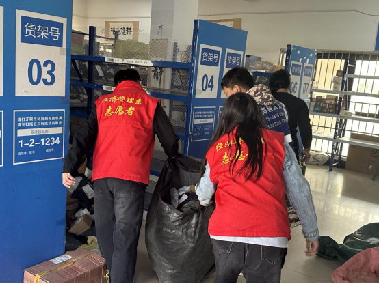在驿站取件的高峰期,志愿者们身着统一服装,在货架和出库台前穿梭,询问并引导同学查找快递,疏导门前人流,解决快递的出库问题。在志愿者的热情帮助下,菜鸟驿站的取件效率得到了有效提高,赢得了大家的一致赞扬。