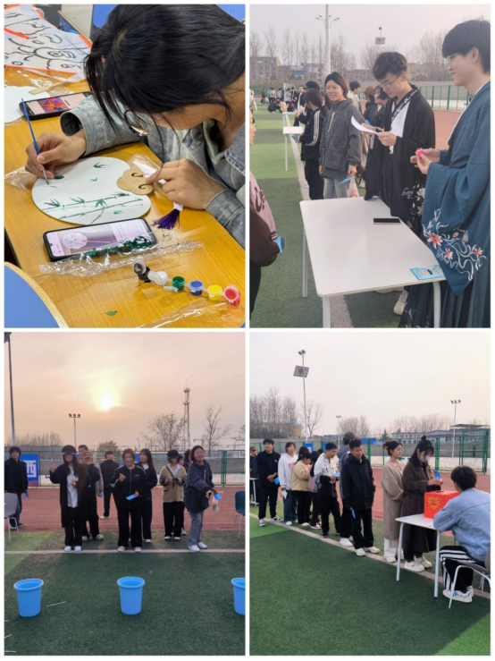 “风起正清明 花落日渐暖”活动共设蹴鞠、纸鸢DIY、对诗和投壶等四个项目,同学们凭借游戏闯关获得的盖章进行抽奖,小奖品种类多样,有青团、灯笼、福袋等等。操场上同学们运球射门的飒爽英姿、创意十足的自创纸鸢和扇面、对诗时低头沉思的模样和投壶命中时的得意,营造了热闹非凡的活动现场。
