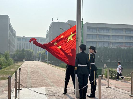 伴随一声响亮的“出旗”,国旗队迈着坚定有力的步伐迈向升旗台,国旗在庄严的国歌声中冉冉升起、迎风飘扬。