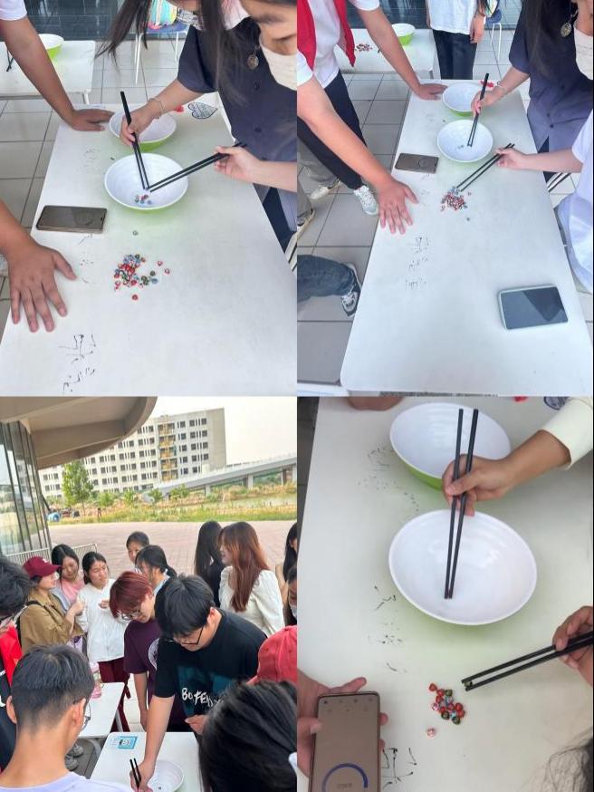 活动现场设置一分钟钓粽子、巧手夹粽子、蒙眼吃粽子三个小游戏。参赛者们签到后开始比拼。在一分钟钓粽子环节,志愿者事先准备了小鱼钩、粽子,参赛者们积极参与,现场气氛紧张而刺激。巧手夹粽子即又快又准地将小粽子模型夹到指定位置,考验了同学们的“筷子功”。最有趣的是蒙眼吃粽子,一位同学蒙着眼睛,在队友的指引剥粽子喂粽子,这一过程充满了欢笑和惊喜,将现场气氛推向了高潮。外教老师也加入同学们的队伍中,活动现场其乐融融,让大家对端午节传统节日有了更深入地了解。