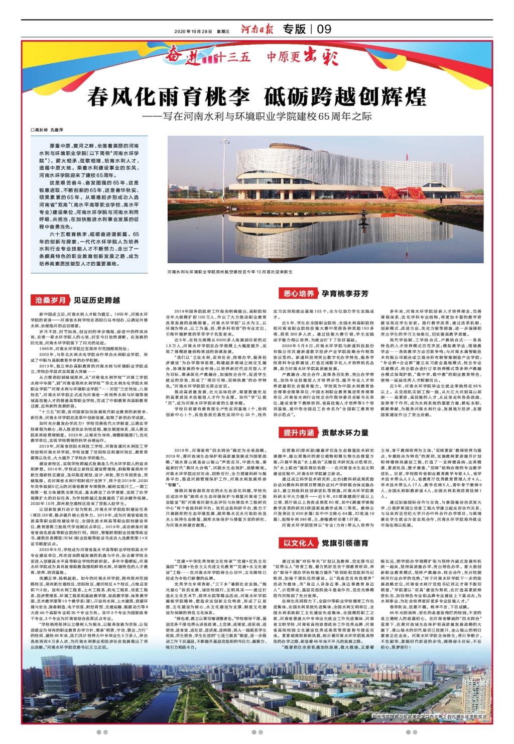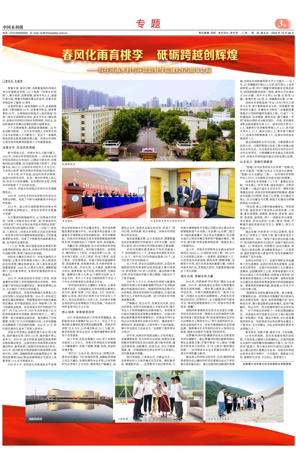 10月28日,《中国水利报》《河南日报》专版刊登文章《春风化雨育桃李 砥砺跨越创辉煌——写在ylzzcom永利总站线路检测建校65周年之际》,从“沧桑岁月 见证历史跨越”、“悉心培养 孕育桃李芬芳”、“提升内涵 贡献水环力量”、“以文化人 党旗引领德育”等四个方面,对ylzzcom永利总站线路检测建校65年来所取得的成就进行了深度报道。