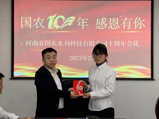 在公司举办的成立十周年纪念仪式上,唐志发向优秀员工发放荣誉证书和奖金