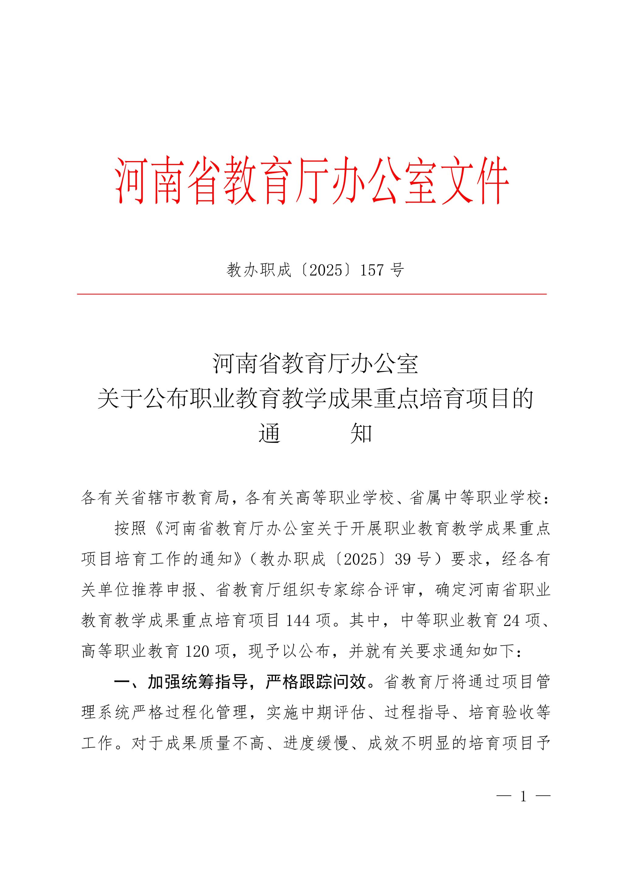 职业教育教学成果重点培育项目是贯彻党的教育方针,落实立德树人根本任务的重要抓手,是牢牢把握新时代对职业教育事业发展提出的新要求,重点聚焦服务“一带一路”建设、黄河流域高质量发展、中部地区崛起等国家重大战略,服务我省重点产业链发展,通过从区域、院校实践中总结经验,探索有效模式和机制,提炼出标识性强的核心概念,形成解决问题、促进工作的政策举措。