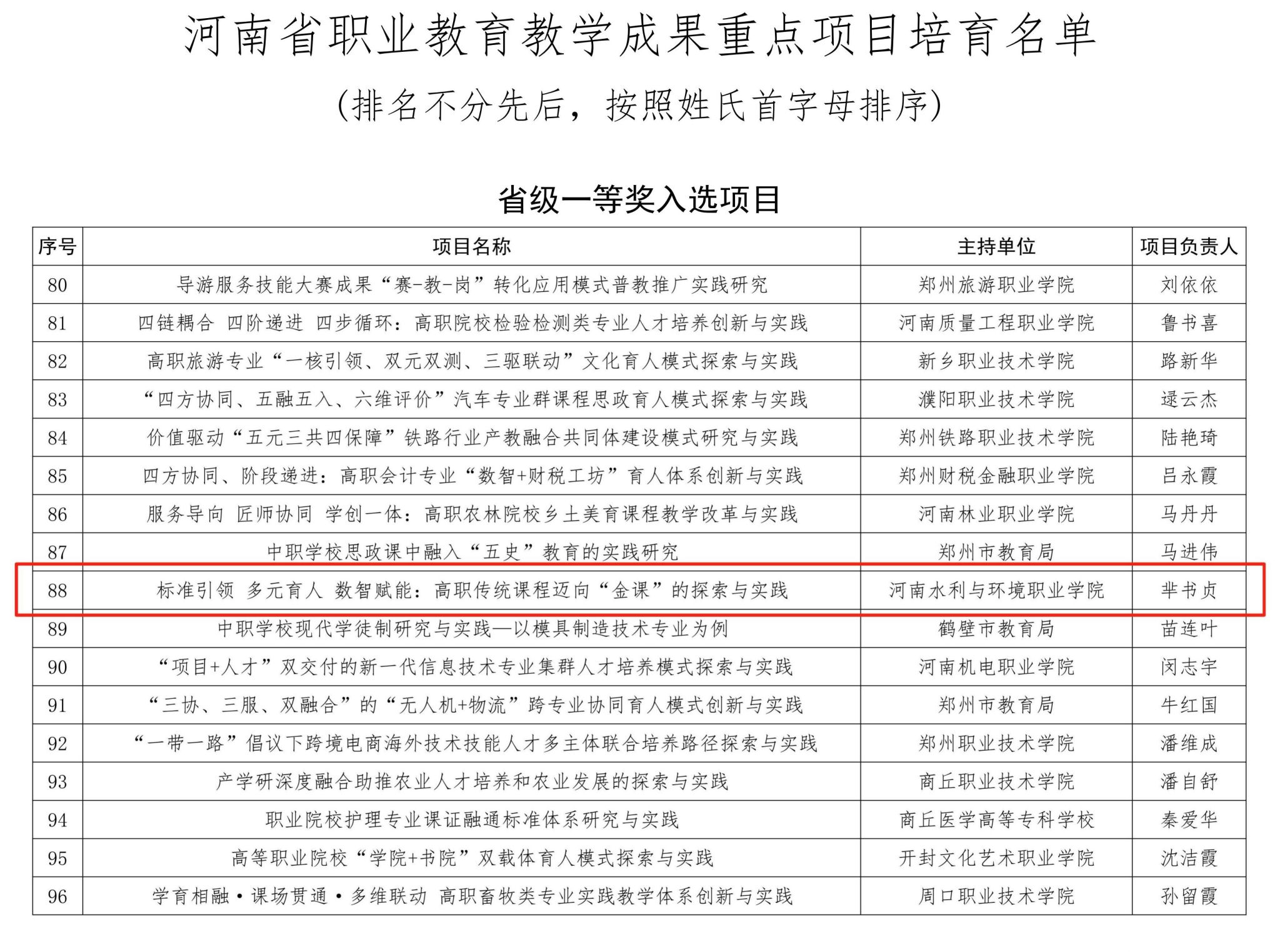 近日,河南省教育厅下发了《关于公布职业教育教学成果重点培育项目的通知》(教办职成〔2025〕157号),ylzzcom永利总站线路检测交通工程学院芈书贞申报的《标准引领、多元育人、数智赋能:高职传统课程迈向“金课”的探索与实践》获批省级一等奖入选项目。