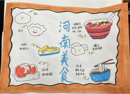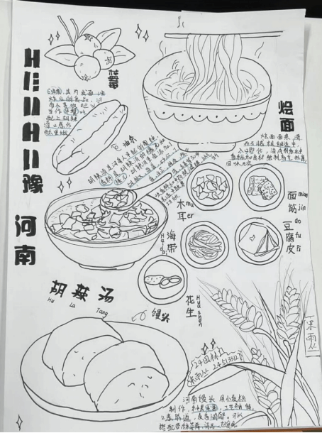 活动现场,伴随悠扬音乐,同学们拿起画笔,通过线条与色彩,与家乡美食进行一场特别“对话”。同学们一边展示绘画技巧,一边交流家乡美食特色及地域文化。擅长工笔画的同学,细致勾勒出家乡小吃纹理;善用色彩的同学,多层次描绘出对家乡美食的眷恋。这些精美的手抄报,浓缩家乡美食文化,既展现个人才华,也为家乡美食“代言”,传播地域美食魅力。